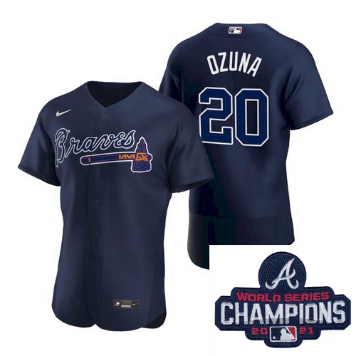 Men Nike Atlanta Braves 20 Marcell Ozuna Blue Alternate Stitched Baseball Stitched MLB 2021 Champions Patch Jersey