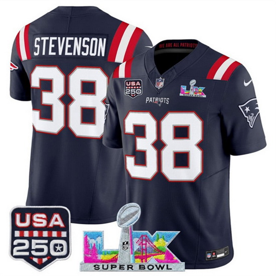 Home>NFL>2025 2026 Super Bowl LX>New England Patriots>Men New England Patriots 38 Rhamondre Stevenson Navy 2025 F U S E Super Bowl LX Patch And USA 250 27 Patch Vapor Limited Football Stitched Jersey