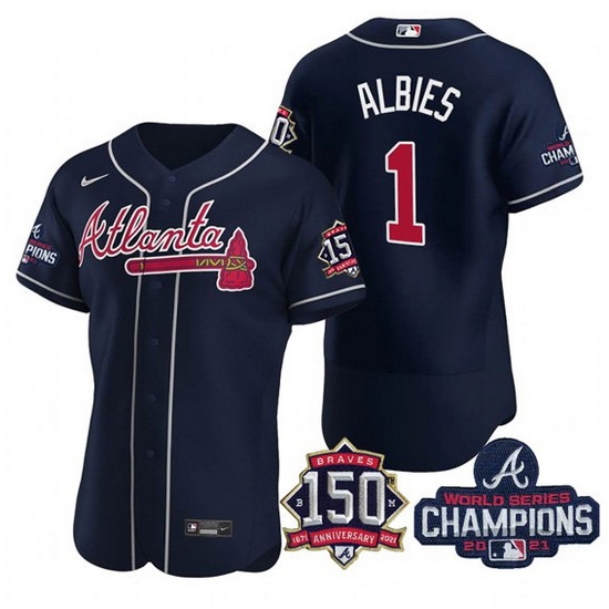 Men's Navy Atlanta Braves #1 Ozzie Albies 2021 World Series Champions With 150th Anniversary Flex Base Stitched Jersey