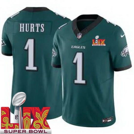 Home>NFL>2024 2025 Super Bowl LIX>Philadelphia Eagles>Youth Philadelphia Eagles Jalen Hurts #1 Green 2024 2025 Super Bowl LIX F U S E Stitched NFL Jersey